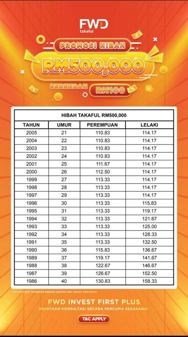 Harga caruman bulanan akan ikut umur, pekerjaan, status merokok. Lebih berusia umur anda harga akan lebih mahal kerana faktor risiko yang meningkat. Bertindak sekarang, lock harga masa tengah muda.